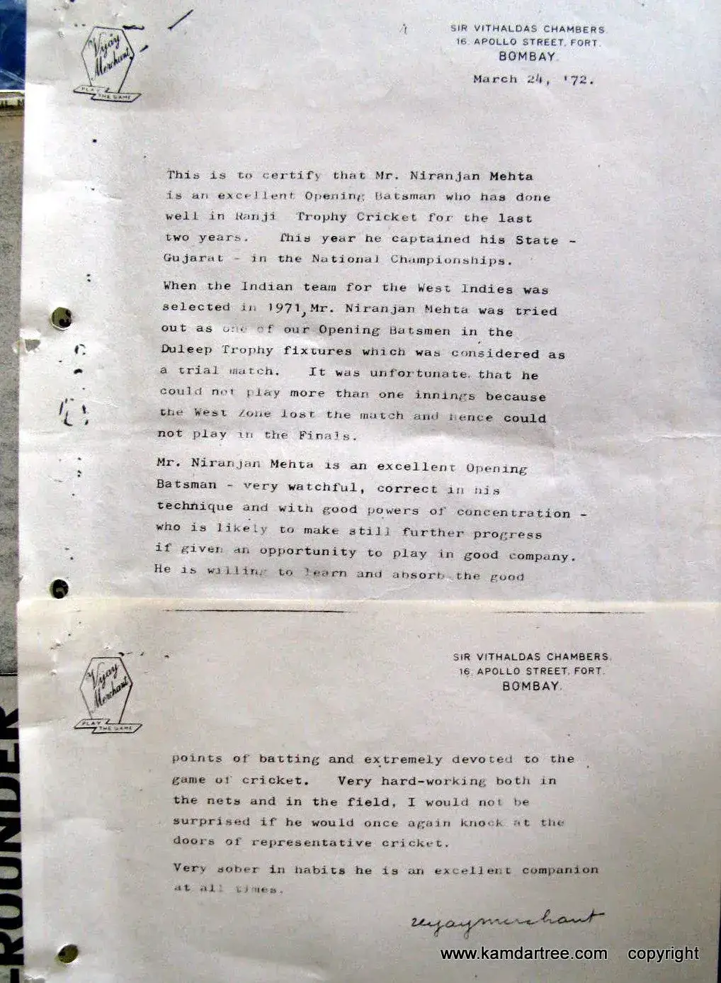 The whole idea of this website is to share the old satisfying cricketing days of Gujarat cricketers — Niranjan Mehta in Gujarat, Saurashtra, England, Scotland, and the Mafatlal Group — with friends and cricket associates. Many old cricketers do not have their photographs. This is an opportunity for all of us to share our good cricketing days. Initially created about 25 years ago, coding upgrades brought us here anew.